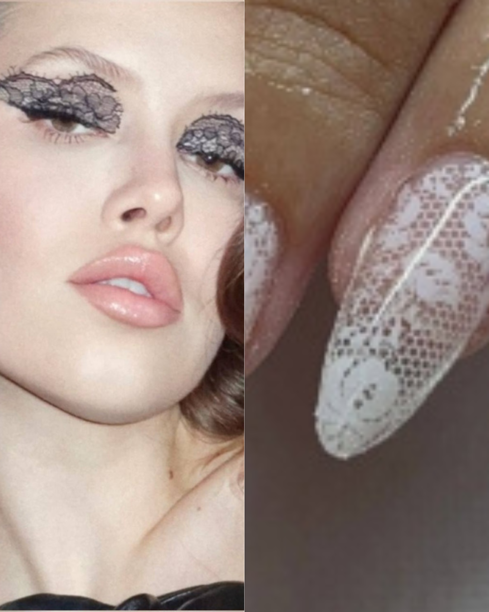 Qui tocchiamo vette di eleganza vera. Il pizzo passa dall'abito alle unghie e persino al trucco occhi, con texture che ricordano trame preziose. Quando potremmo indossare un make up del genere? Non saprei proprio! Forse ad una festa a tema... Ma per la nail art trovo sia portabilissima, magari per impreziosire uno stile minimale: Focal point?! Sì, le mie unghie...